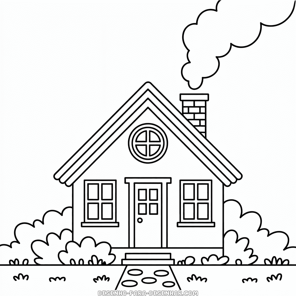 Desenho fácil da Casa no Outono para imprimir gratuitamente, uma casa acolhedora cercada por folhas caídas que captura a magia do outono. Desenho para colorir simples perfeito para decalcar ou pintar com crianças. Modelo em alta resolução, ideal para impressão em PDF preto e branco no formato A4.
