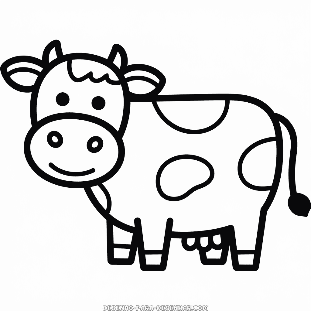 Desenho fácil de uma Vaca Fofinha para imprimir gratuitamente, uma vaquinha sorridente e adorável que irá encantar as crianças enquanto colorem. Desenho para colorir simples perfeito para decalcar ou pintar com crianças. Modelo em alta resolução, ideal para impressão em PDF preto e branco no formato A4.
