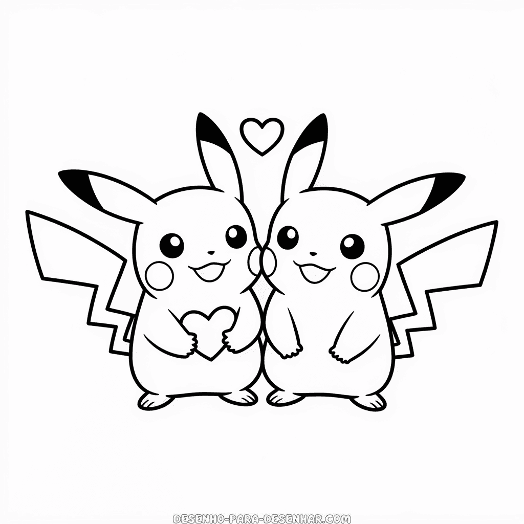 Desenho fácil do casal Pikachu para imprimir gratuitamente, um adorável casal de Pikachus em uma cena charmosa, perfeito para fãs de Pokémon. Desenho para colorir simples perfeito para decalcar ou pintar com crianças. Modelo em alta resolução, ideal para impressão em PDF preto e branco no formato A4.