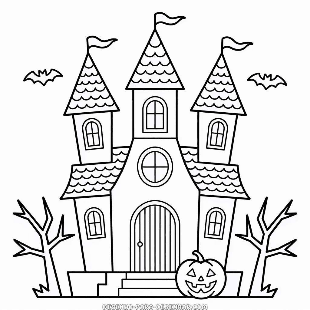 Desenho fácil do Castelo de Halloween para imprimir gratuitamente, este castelo misterioso é perfeito para o tema do Dia das Bruxas e encanta com suas torres altas e atmosfera assombrada. Desenho para colorir simples perfeito para decalcar ou pintar com crianças. Modelo em alta resolução, ideal para impressão em PDF preto e branco no formato A4.