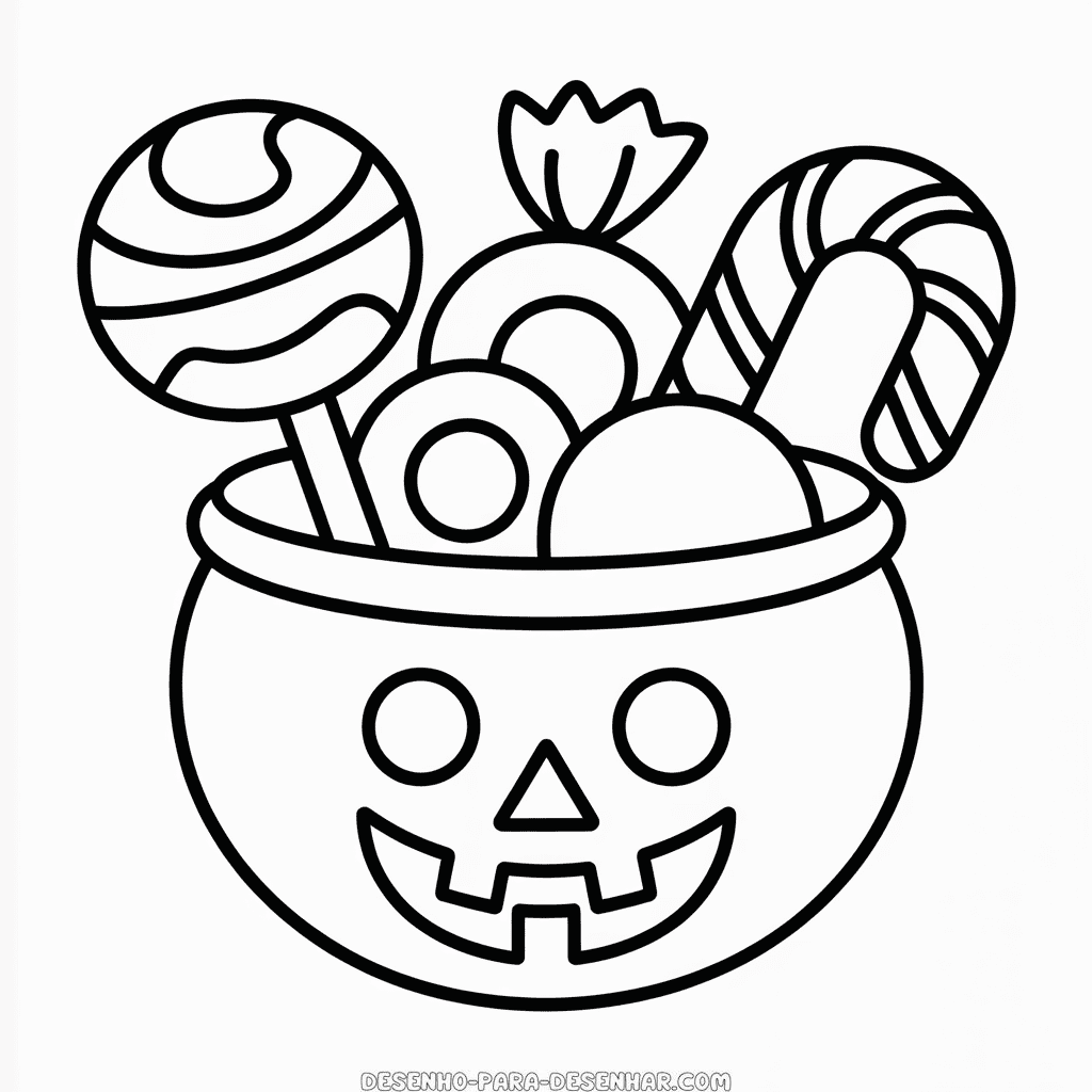Desenho fácil do Cesto de Halloween para imprimir gratuitamente, um cesto cheio de surpresas e doces típico das festas de Halloween. Desenho para colorir simples perfeito para decalcar ou pintar com crianças. Modelo em alta resolução, ideal para impressão em PDF preto e branco no formato A4.