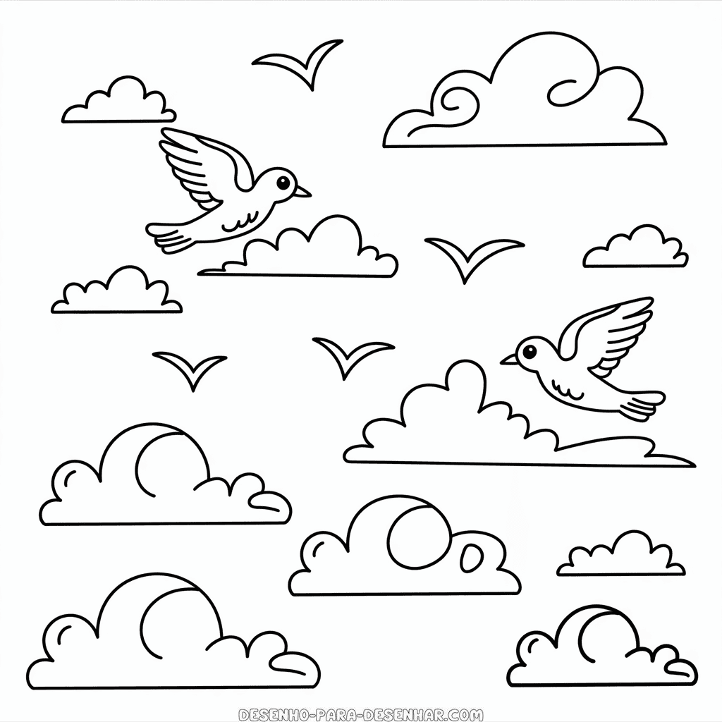 Desenho fácil do céu de outono para imprimir gratuitamente, com nuvens fofinhas e folhas de outono que caem suavemente. Desenho para colorir simples perfeito para decalcar ou pintar com crianças. Modelo em alta resolução, ideal para impressão em PDF preto e branco no formato A4.