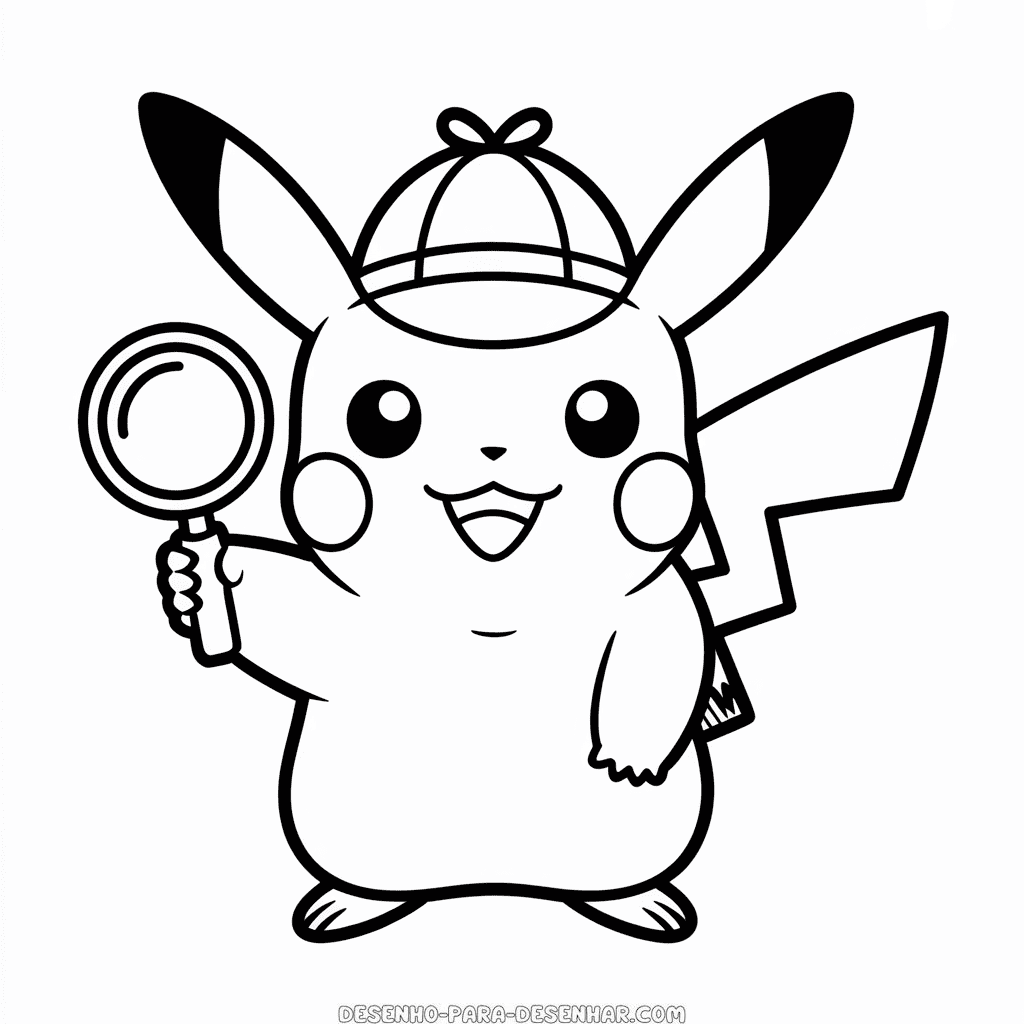 Desenho fácil do Detetive Pikachu para imprimir gratuitamente, mostrando o adorável Pikachu com seu chapéu de detetive, ideal para fãs de Pokémon. Desenho para colorir simples perfeito para decalcar ou pintar com crianças. Modelo em alta resolução, ideal para impressão em PDF preto e branco no formato A4.