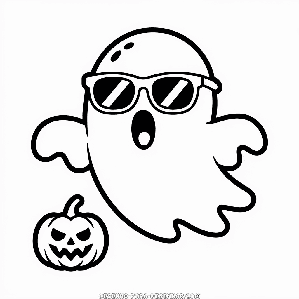 Desenho fácil do Legal e Assustador Halloween para imprimir gratuitamente, com elementos clássicos como abóboras sinistras e fantasmas amigáveis que capturam o espírito divertido e misterioso da celebração. Desenho para colorir simples perfeito para decalcar ou pintar com crianças. Modelo em alta resolução, ideal para impressão em PDF preto e branco no formato A4.