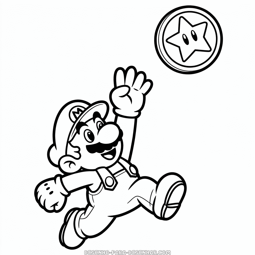 Desenho fácil do Mario perseguindo moeda para imprimir gratuitamente, capture a diversão do famoso encanador da Nintendo enquanto ele corre atrás de uma moeda brilhante. Desenho para colorir simples perfeito para decalcar ou pintar com crianças. Modelo em alta resolução, ideal para impressão em PDF preto e branco no formato A4.
