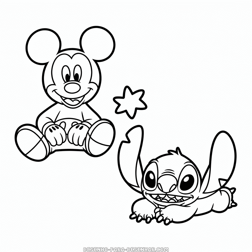 Desenho fácil do Mickey e Stitch para imprimir gratuitamente, mostrando a divertida amizade entre o ratinho famoso da Disney e o simpático alienígena azul. Desenho para colorir simples perfeito para decalcar ou pintar com crianças. Modelo em alta resolução, ideal para impressão em PDF preto e branco no formato A4.