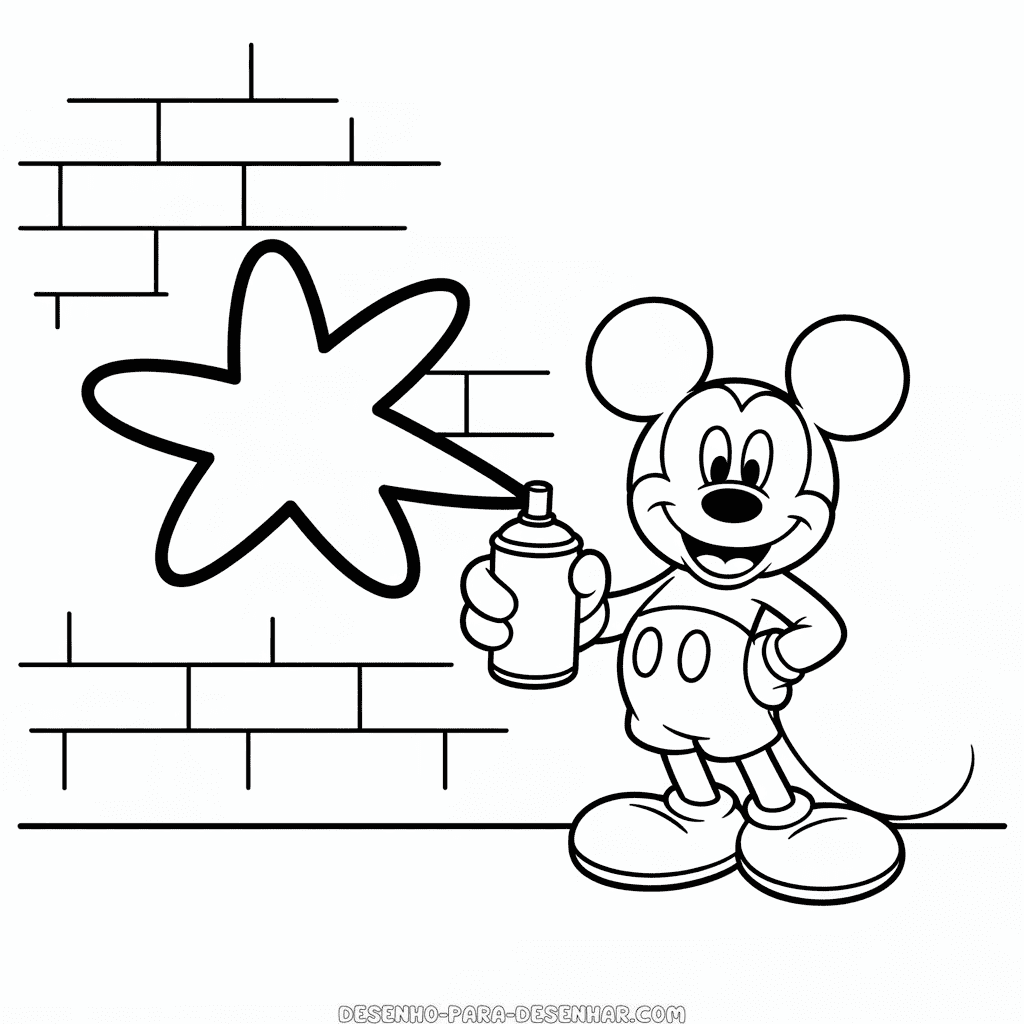 Desenho fácil do Mickey fazendo grafite para imprimir gratuitamente, exibindo o famoso personagem de Disney envolvido em uma atividade artística divertida. Desenho para colorir simples perfeito para decalcar ou pintar com crianças. Modelo em alta resolução, ideal para impressão em PDF preto e branco no formato A4.