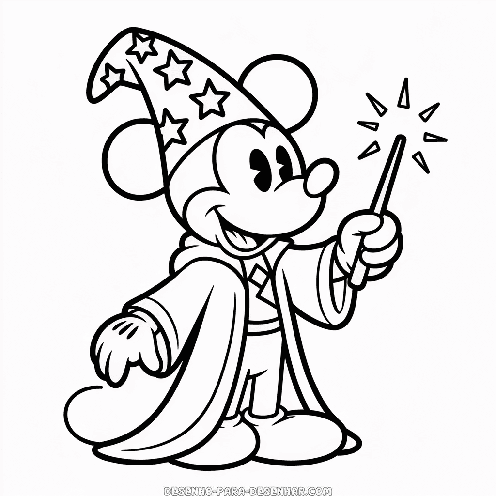 Desenho fácil do Mickey Feiticeiro para imprimir gratuitamente, uma imagem encantadora do Mickey vestindo um chapéu de feiticeiro, perfeita para crianças que adoram os clássicos personagens da Disney. Desenho para colorir simples perfeito para decalcar ou pintar com crianças. Modelo em alta resolução, ideal para impressão em PDF preto e branco no formato A4.