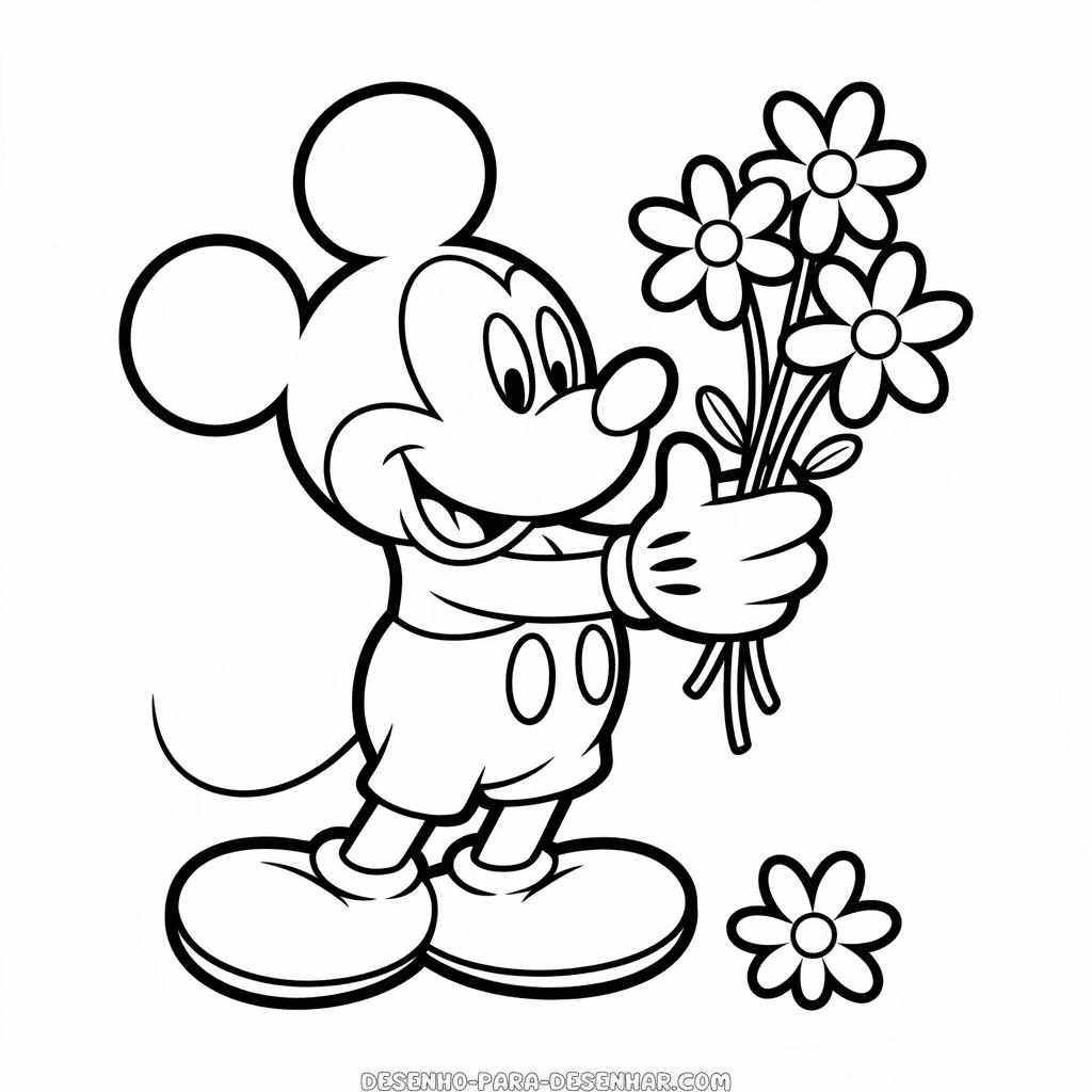 Desenho fácil do Mickey segurando flores para imprimir gratuitamente, mostrando o famoso personagem Disney em um gesto carinhoso com flores nas mãos, ideal para despertar a criatividade infantil. Desenho para colorir simples perfeito para decalcar ou pintar com crianças. Modelo em alta resolução, ideal para impressão em PDF preto e branco no formato A4.