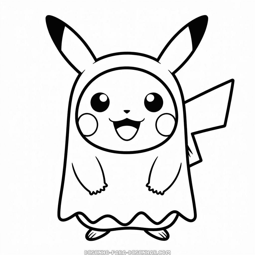 Desenho fácil do Pikachu de Halloween para imprimir gratuitamente, Pikachu está pronto para assustar e encantar em seu traje de Halloween nesta divertida imagem, perfeita para os fãs de Pokémon. Desenho para colorir simples perfeito para decalcar ou pintar com crianças. Modelo em alta resolução, ideal para impressão em PDF preto e branco no formato A4.