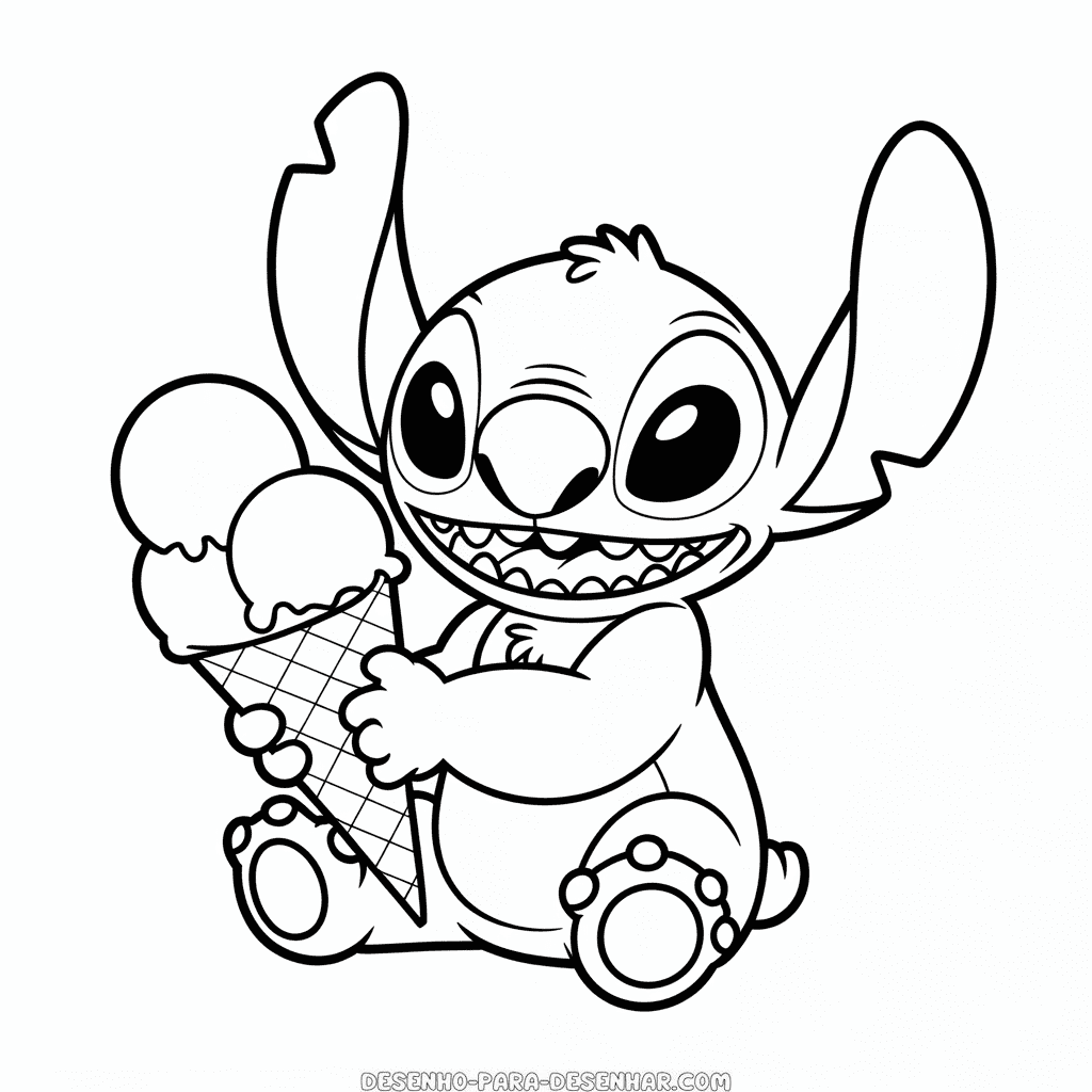 Desenho fácil do Stitch com sorvete para imprimir gratuitamente, uma ilustração encantadora do personagem da Disney, Stitch, saboreando um delicioso sorvete que cativa qualquer fã infantil. Desenho para colorir simples perfeito para decalcar ou pintar com crianças. Modelo em alta resolução, ideal para impressão em PDF preto e branco no formato A4.