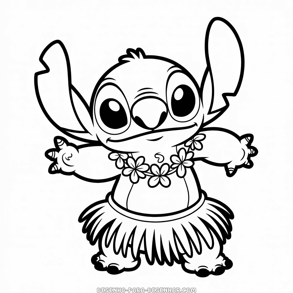 Desenho fácil do Stitch dançando hula para imprimir gratuitamente, retratando o adorável personagem da Disney em uma animada dança tropical. Desenho para colorir simples perfeito para decalcar ou pintar com crianças. Modelo em alta resolução, ideal para impressão em PDF preto e branco no formato A4.