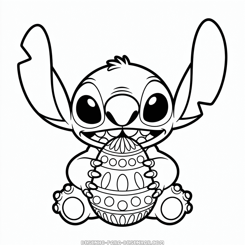 Desenho fácil do Stitch de Páscoa para imprimir gratuitamente, apresentando o adorável alienígena da Disney vestido com um tema de Páscoa, perfeito para as crianças se divertirem enquanto colorem. Desenho para colorir simples perfeito para decalcar ou pintar com crianças. Modelo em alta resolução, ideal para impressão em PDF preto e branco no formato A4.