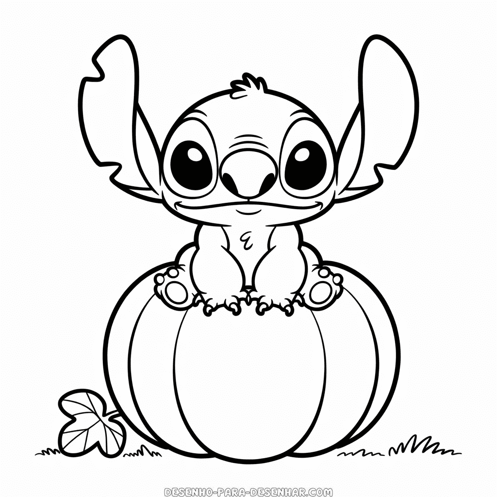 Desenho fácil do Stitch em uma abóbora para imprimir gratuitamente, uma ilustração divertida de Stitch explorando o Halloween, ideal para crianças e fãs de Disney. Desenho para colorir simples perfeito para decalcar ou pintar com crianças. Modelo em alta resolução, ideal para impressão em PDF preto e branco no formato A4.