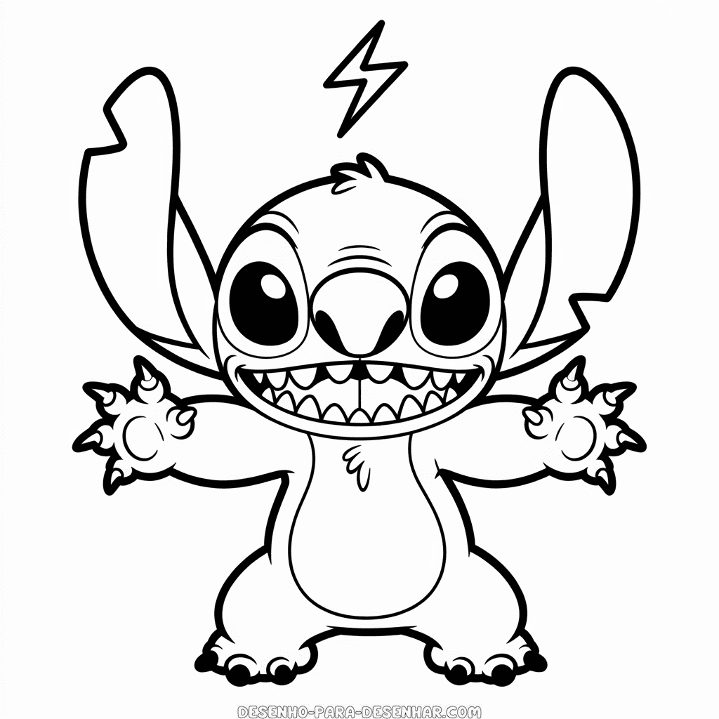 Desenho fácil do Stitch Malvado para imprimir gratuitamente, mostrando o personagem Stitch em sua versão mais travessa e cheia de personalidade. Desenho para colorir simples perfeito para decalcar ou pintar com crianças. Modelo em alta resolução, ideal para impressão em PDF preto e branco no formato A4.